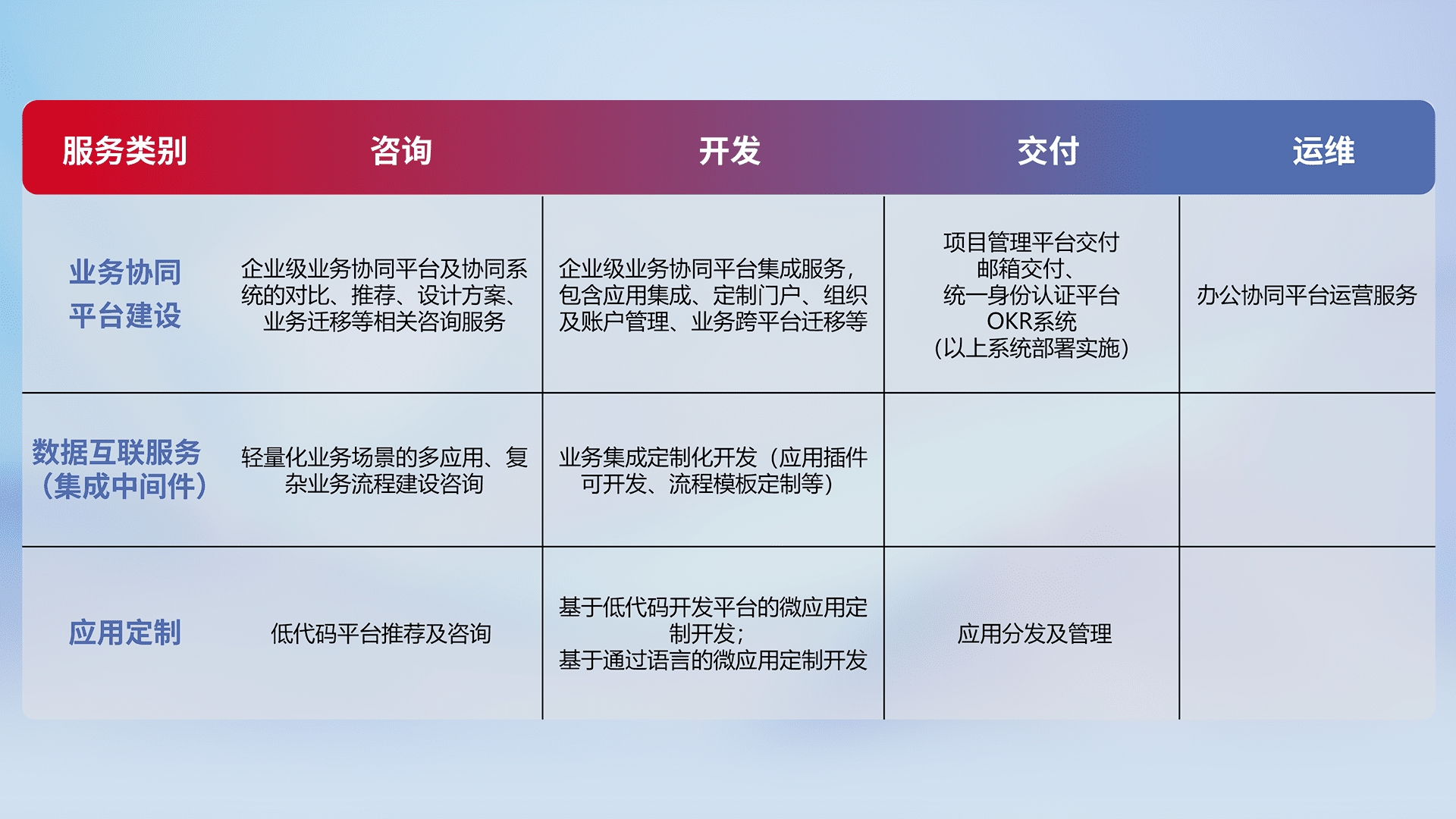 针对钉钉、、、企微、、、、IDaas等平台级产品提供产品的规划、、、方案、、、、交付、、、定制化开发等服务,,实现如统一协同办公、、、智能客户服务、、混合会议管理、、、、智能数据查询、、、等业务场景,,,,实现数字化转型。。。。